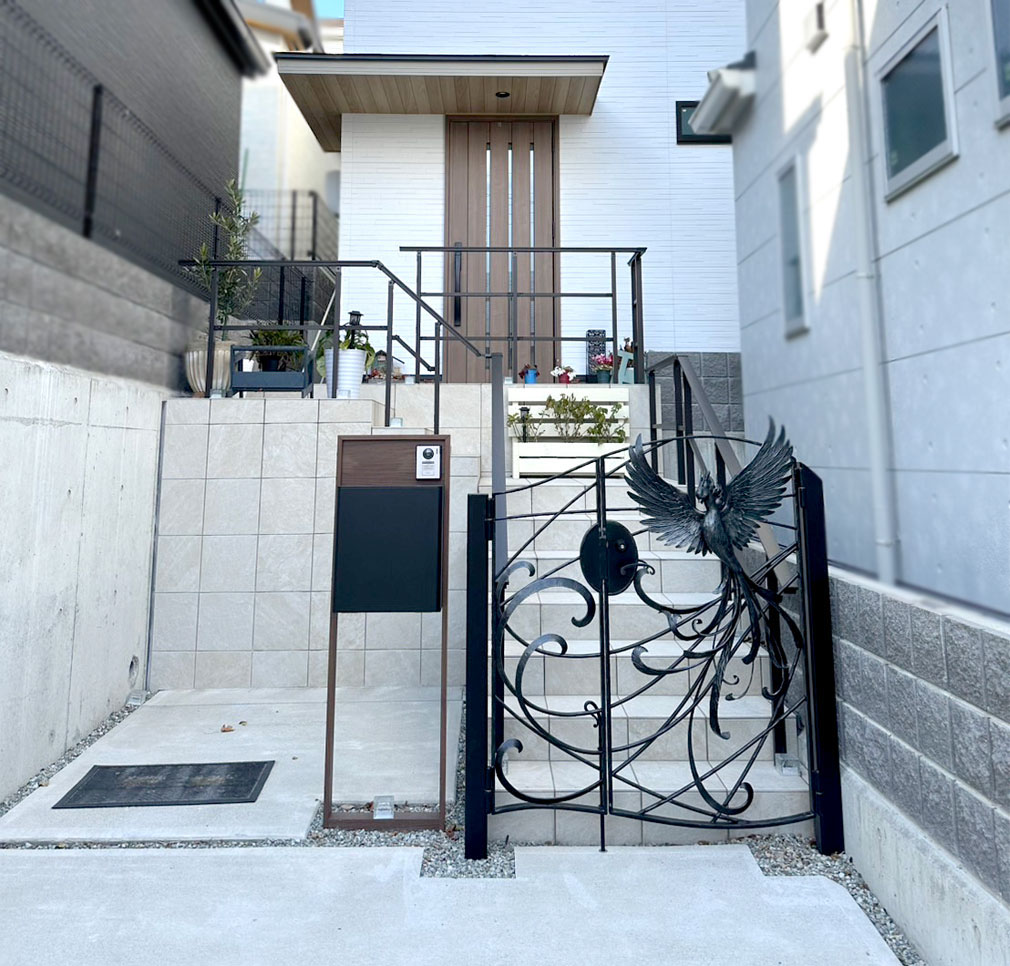今回のご要望は、他所ではあまり見かけない様な、アイアンのオリジナル感あふれる門扉を設置したい、というものでした。