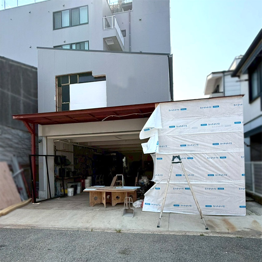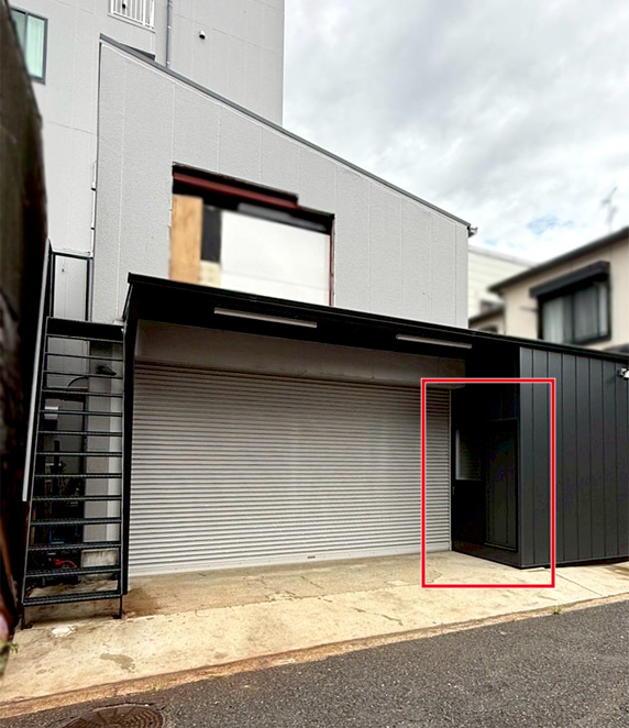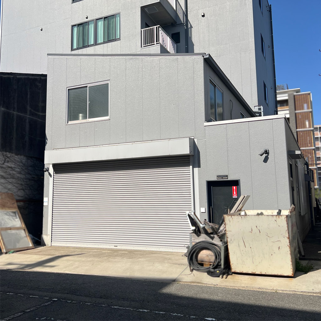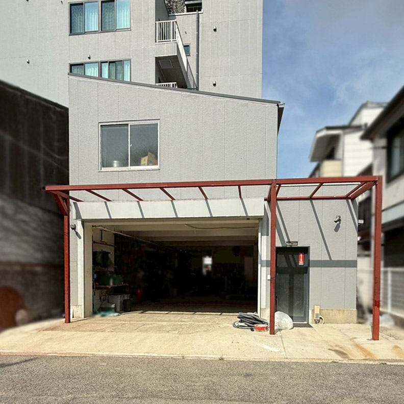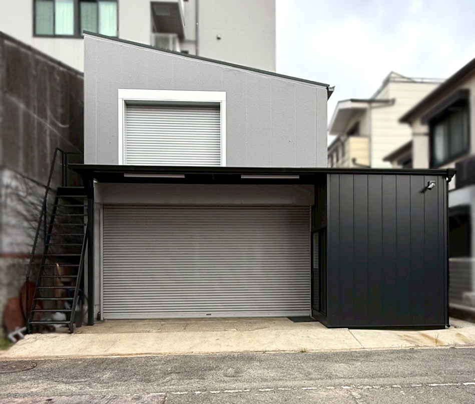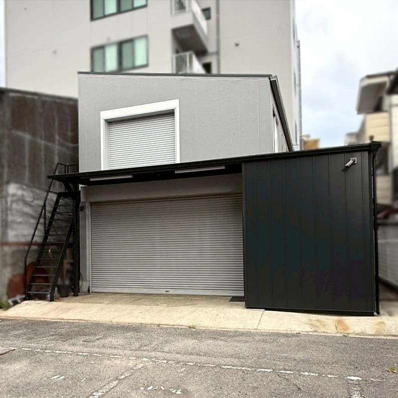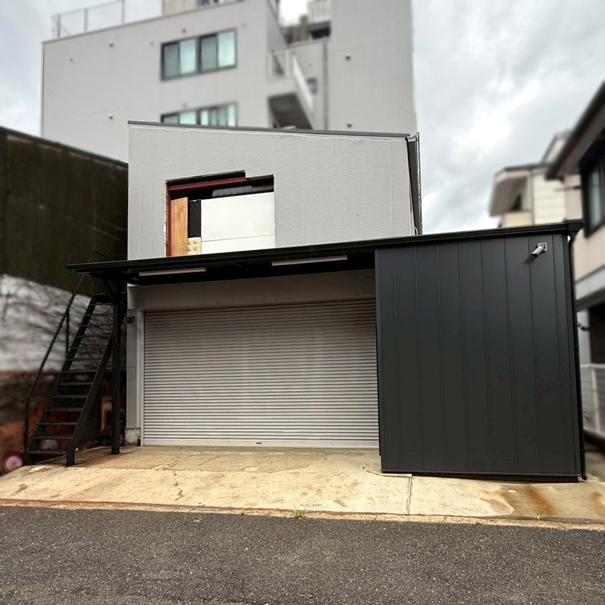事務所裏口にステージ設置、2階搬入用シャッター新設、鉄骨外階段、洗濯機置き場 設置工事